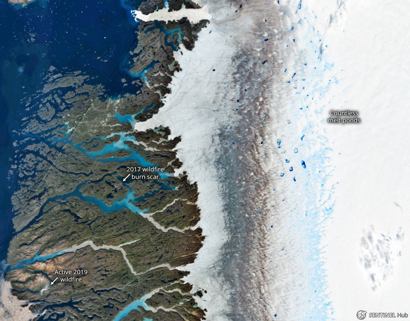 Pierre Markuse, experto en imágenes, ha resumido esa situación compilando diversas fotografías por satélite de la isla, lo que le ha permitido reflejar el impacto del cambio climático en Groendlandia, la mayor isla del mundo cuya superficie se encuentra cubierta en un 77 % por una espesa capa de hielo. En particular, su publicación muestra cómo los incendios forestales afectan a una de las mayores reservas de hielo del planeta.