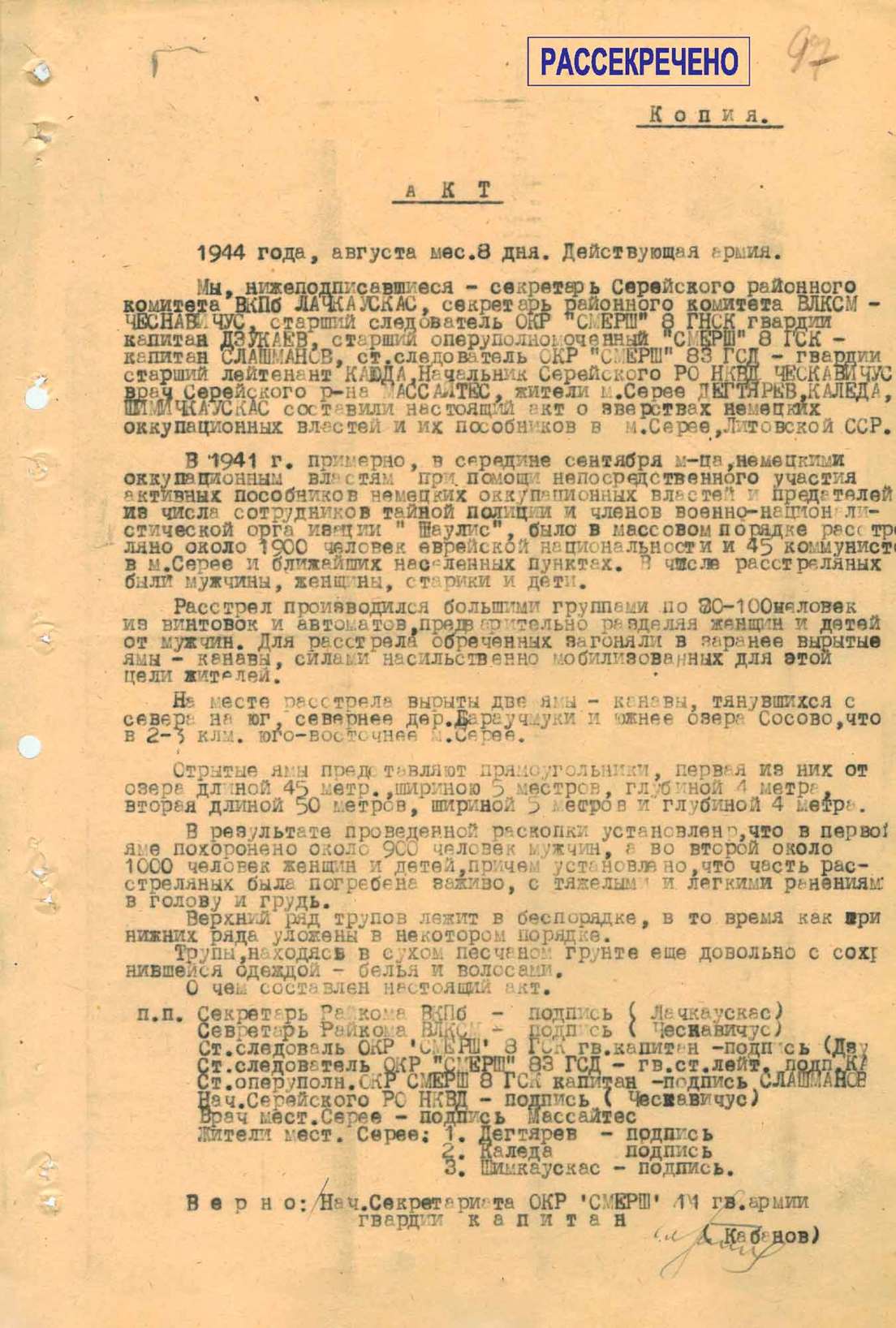 "En el curso del trabajo operativo en el territorio liberado, establecimos los hechos del exterminio masivo de ciudadanos soviéticos durante la ocupación alemana de la RSS [República Socialista Soviética] de Lituania. Según las declaraciones indagatorias de los agentes, (...) se estableció que solo en los distritos de Marijampolė, Alytus y Vilkovysh, más de 20.000 ciudadanos soviéticos inocentes fueron fusilados y ejecutados durante la estadía de los invasores fascistas, especialmente esto se refiere a la población judía y activistas del partido y organismos locales", reza el documento.