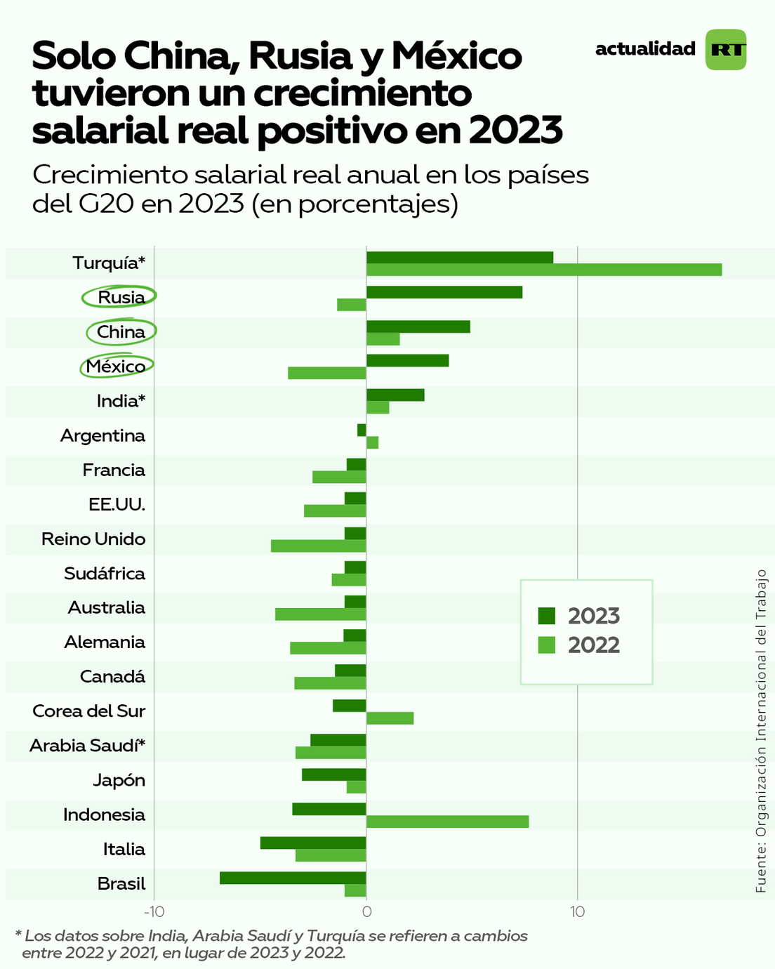 "Los ingresos actuales de los hogares disminuyeron en el 2023 en la mayoría de los países del G20. Solo se observó un crecimiento positivo de los salarios reales en China, la Federación de Rusia y México", señala el reporte publicado este miércoles. "Los salarios aumentaron más en China y Rusia, donde el crecimiento de la productividad estuvo entre los más rápidos del G20", se destaca.