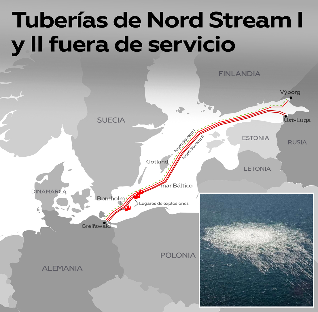 El sabotaje de los gasoductos Nord Stream I y II tuvo lugar en el fondo del mar Báltico, en las zonas económicas exclusivas de Dinamarca y de Suecia, cerca de la isla Bornholm, el 26 de septiembre de 2022.