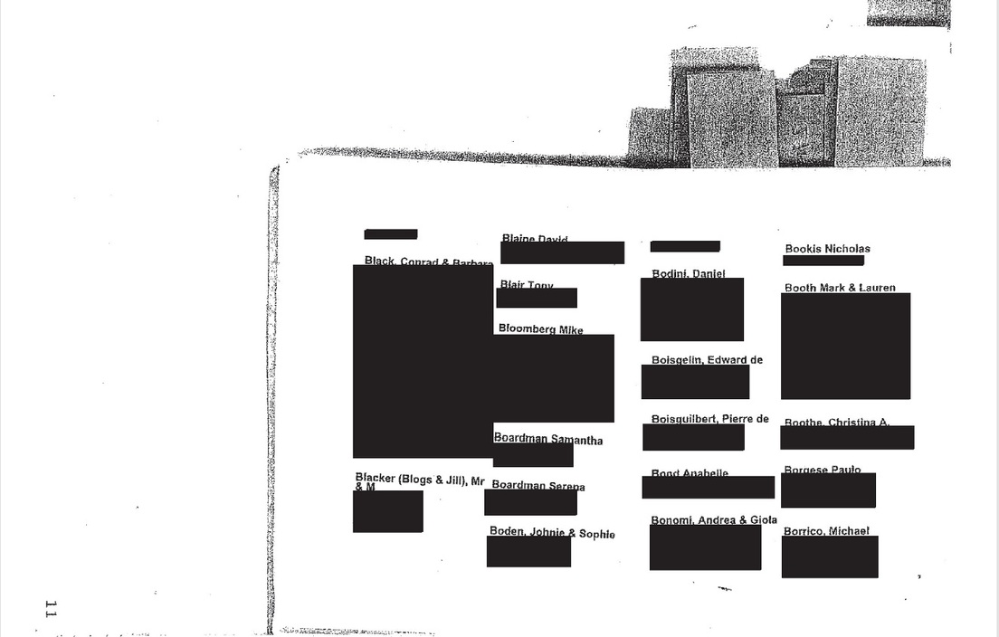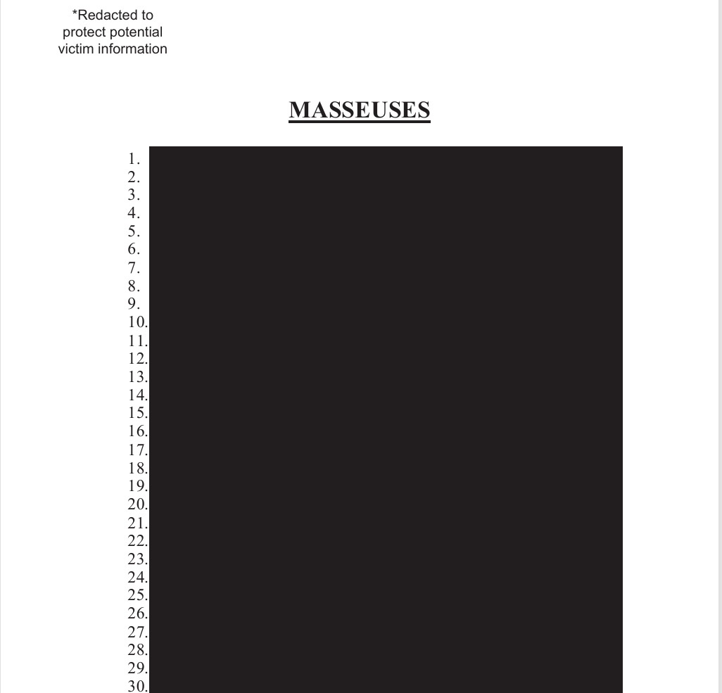 Los materiales contienen decenas de páginas de la agenda telefónica de Epstein, incluida una lista de contactos sin contexto y con direcciones redactadas. Otro documento titulado 'Masajistas' consiste en una lista de 254 personas, cuya información ha sido censurada completamente para "proteger a potenciales víctimas".