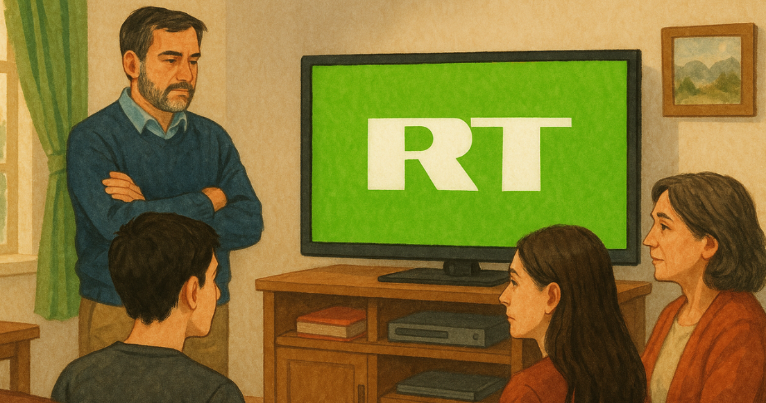 En uno de los artículos incluso se llegó a ilustrar la 'investigación' con una imagen de un padre severo que luce profundamente decepcionado tras descubrir a su familia viendo RT. ¿Es que ya uno no puede irse a trabajar tranquilo sin que la maquinaria propagandística rusa devore a sus seres queridos?
