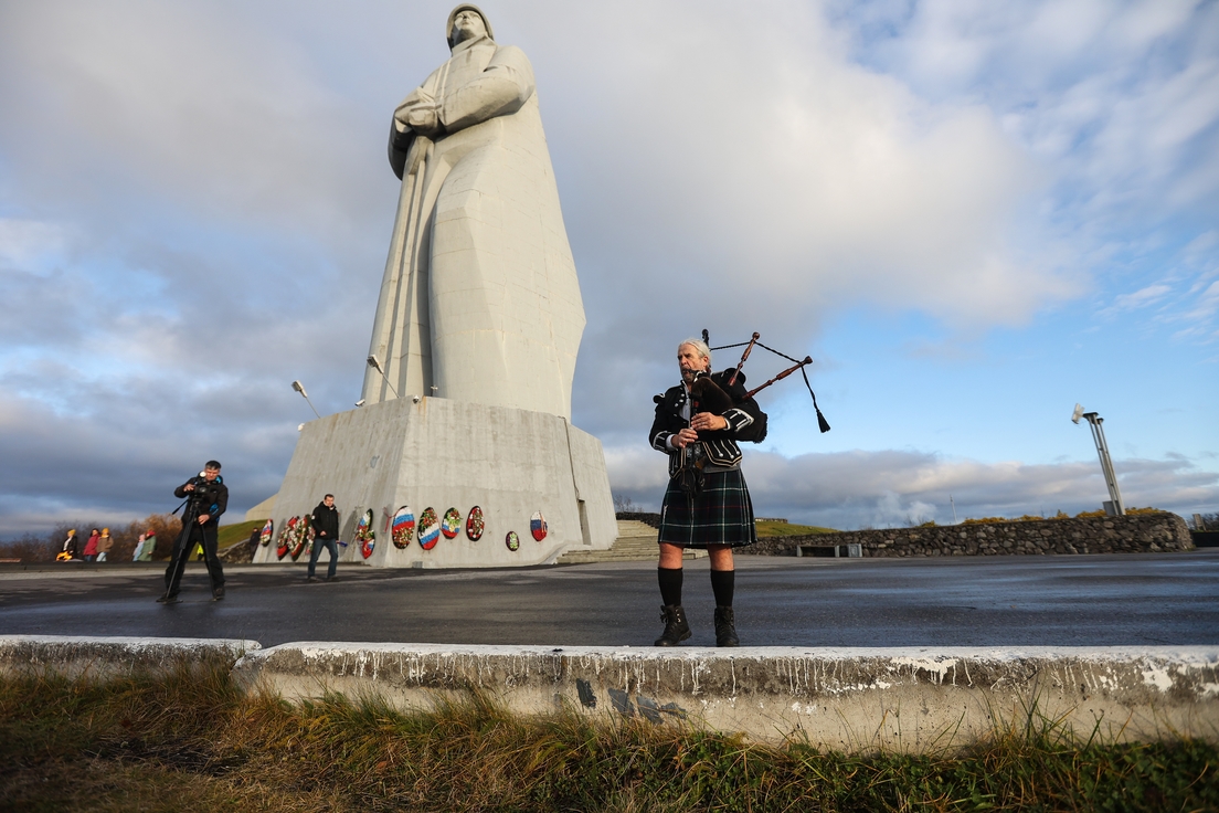 Viendo la tormenta de nieve desde el monumento de Aliosha, yo no sabía que más o menos al mismo tiempo, por el mismo paisaje, caminaba la solitaria figura de un hombre con una gaita. Era Jimi McRae, músico escocés que llegó a Múrmansk y tocó desde estos cerros para sus dos tíos abuelos, que navegaron aquí en los convoyes del Ártico. Uno de ellos, Adam Hogg, para siempre quedó en estas aguas.